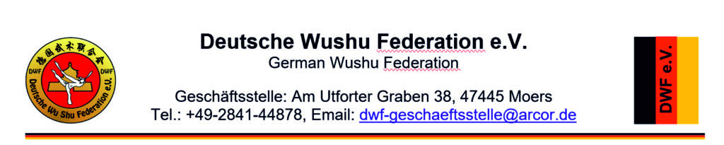 Für eine verbindliche Anmeldung wenden Sie sich bitte per E-Mail oder telefonisch an die Deutsche Wushu Federation e.V. in Moers (siehe Header).